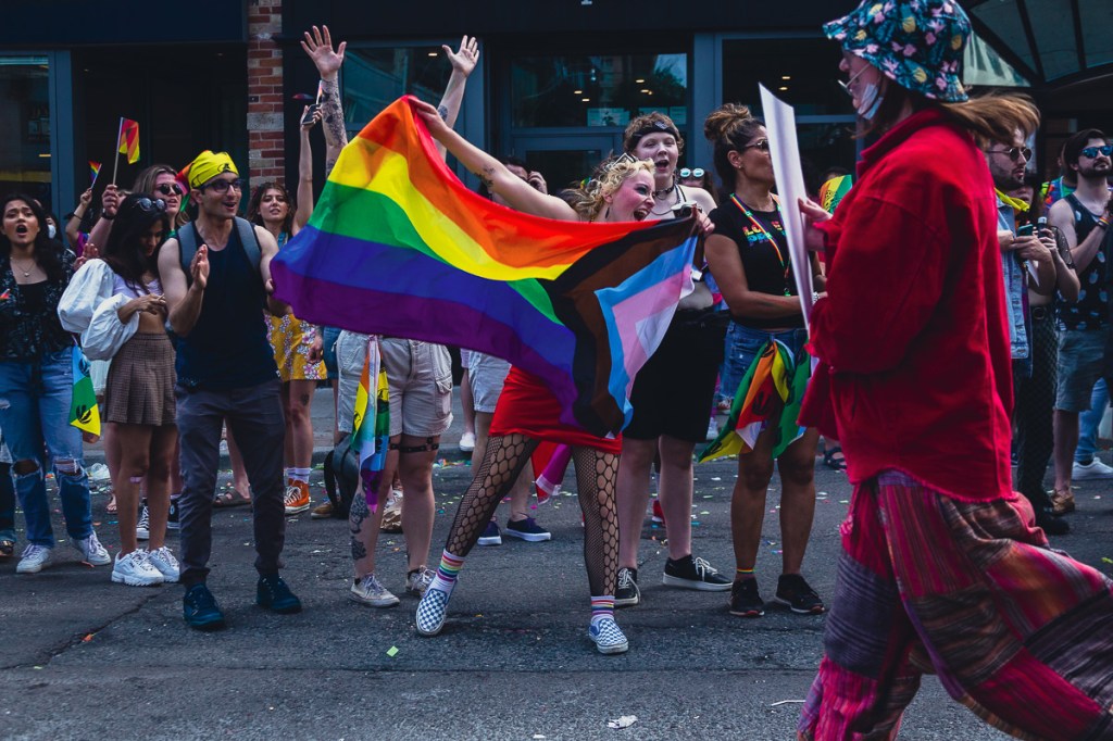 • A smiling woman wearing pink sunglasses and a multi-coloured striped tank top holds a rainbow flag behind while her friends lift her above a crowd on a downtown street. © Andy Lee, 2022. realandylee.com